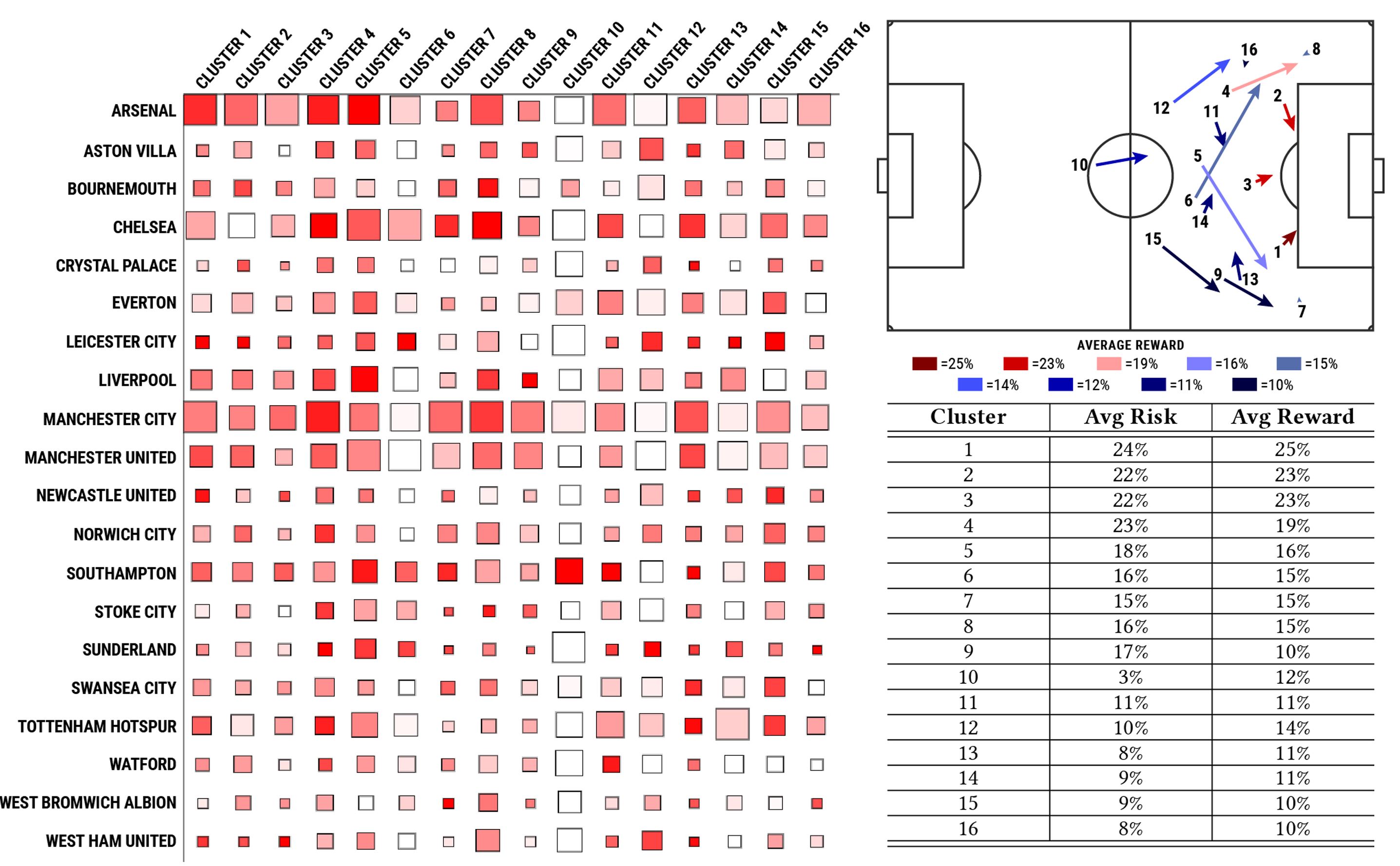 - 표를 보면 클러스터링 1,2,3과 같은 패스 스타일은 위협적이지만, 그만큼 risk도 높아서 높은 스킬이 필요하다. 실제로 클러스터링 1,2,3과 같은 패스는 강팀인 아스날과 맨시티가 많이 수행하는 것을 확인할 수 있다.