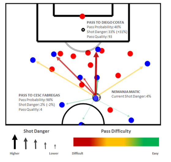 - 우리는 오른쪽 사진이 더 위험하지만, 성공을 한다면 더 높은 shooting chance를 만들 수 있는 패스이다. 그만큼 파브레가스한테 패스하는 오른쪽 상황보다 너 많은 스킬이 필요합니다. 그러나 현재 패스 지표(binary value)에서는 두 상황의 패스 모두 같은 가중치를 갖고 있습니다. 이는 게임 상황을 반영하지 않고 선수과 팀의 지표에 영향을 미칠 수도 있다.