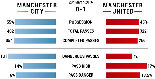 - Pass Risk and Pass Reward(danger) : 맨시티는 맨유에 비하여 더 많은 dangerous pass(131 vs 72)를 했고 더 Danger(16% vs 13.5%)를 했지만, Risk(14% vs 17%)는 더 낮았다.