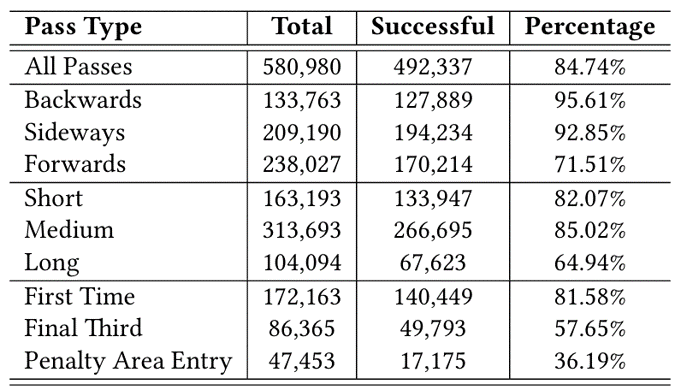 726경기에서 발생한 총 패스는 571,287개이고, 이 중 패스가 성공한 횟수는 468,265개이다. 경기 당 패스의 수로 비교했을 때는, 평균적으로 380.46개가 발생하고 그 중 320.91개 성공했다. 저희의 baseline으로 사용한 패스성공확률은 84.35%이다.